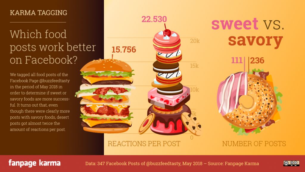 We address this question in our latest Karma Tagging. To find out whether posts with hearty dishes, like pizza, steak and currys, or sweet dishes, like cakes, ice cream and brownies, are more successful on Facebook we analyzed the content of Buzzfeedtasty. We had a look at every post of the page in the time period of May 2018 and labeled them with the tags “sweet” or “savory” to examine which of the categories engages users the most. You will find our infographic at the end of this article.