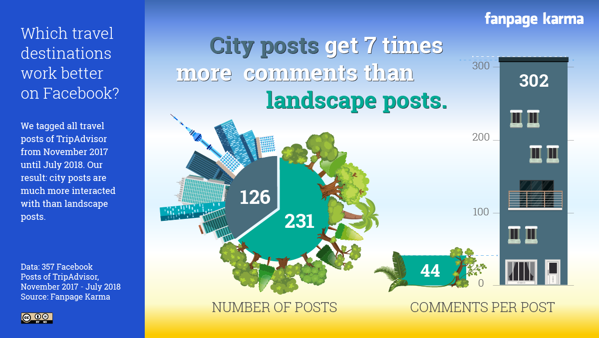 It’s the holiday season and our new Tagging is about travel destinations. Our goal was to find out if the Facebook Community prefers certain vacation spots to others. We placed all posts of TripAdvisor from November 2017 until July 2018 into the categories “city” and “landscape” to figure which one got interacted with more. The result is quite interesting.