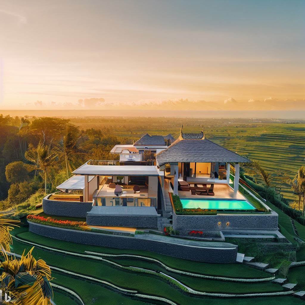 Creation 2 of the prompt: "A luxurious Bali villa framed by rice terraces with magnificent distant views, sunset mood, hyper-realistic photography, Golden Hour 8K 3D" by Bing Image Creator.