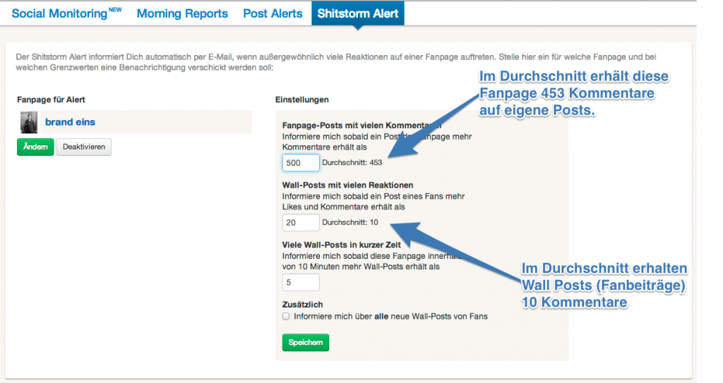 Besonders praktisch: Die Anzahl der Reaktionen kann frei eingestellt werden und immer wieder nach Bedarf angepasst werden. Auch kurzfristige Eskalationen werden dank der zeitlichen Dimension abgefangen: Wenn die Fanpage innerhalb von 10 Minuten mehr Wall Posts erhält, als normalerweise üblich, wird auch eine Benachrichtigung versendet.