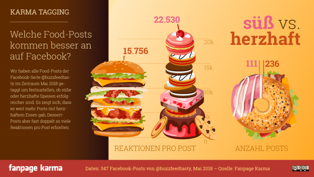 Mit dieser Frage beschäftigen wir uns in unserem aktuellen Karma-Tagging. Um herauszufinden, ob Posts mit herzhaften Speisen, wie Pizza, Steak und Currys, oder süßen Speisen, wie Torten, Eiscreme und Brownies, auf Facebook erfolgreicher sind, haben wir alle Mai-Posts der Seite Buzzfeedtasty auf ihren Inhalt untersucht und mit den Tags “süß” oder “herzhaft” versehen. Die Infographik zur Analyse findest du am Ende des Artikels.