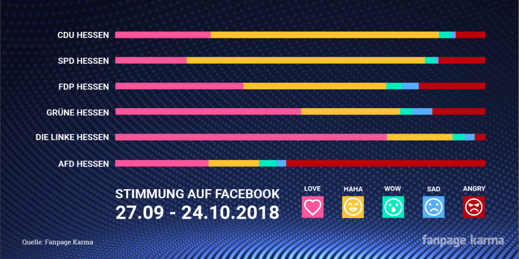 Die vorherrschende Stimmung bei CDU, SPD und FDP in Hessen ist Gelächter. Das klingt im ersten Moment spaßig, heißt in den meisten Fällen aber genau das Gegenteil. Nutzer, die mit Haha auf die Posts der Parteien reagieren, tun dies hauptsächlich, um deren Inhalte lächerlich zu machen. Von April bis September waren das bei der CDU 58% aller Reactions. Bei der SPD waren es 55% und bei der FDP 48%.