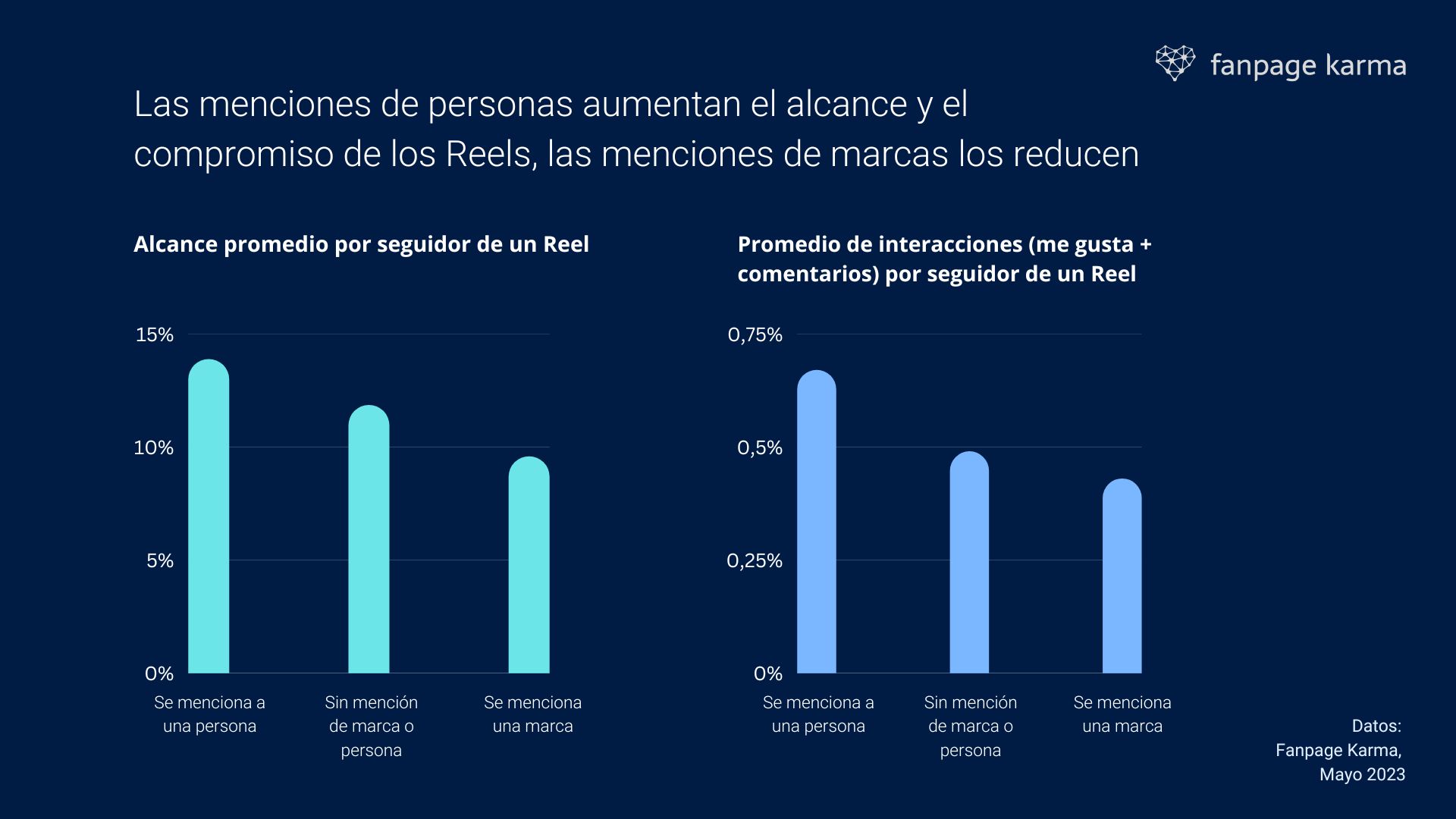 En contraste con la mención de marcas, el estudio muestra que mencionar a otras personas tiene un efecto positivo en tus Reels de Instagram. Mencionar a personas aumenta en promedio las interacciones de los espectadores en un 37% y el alcance en un 17%.